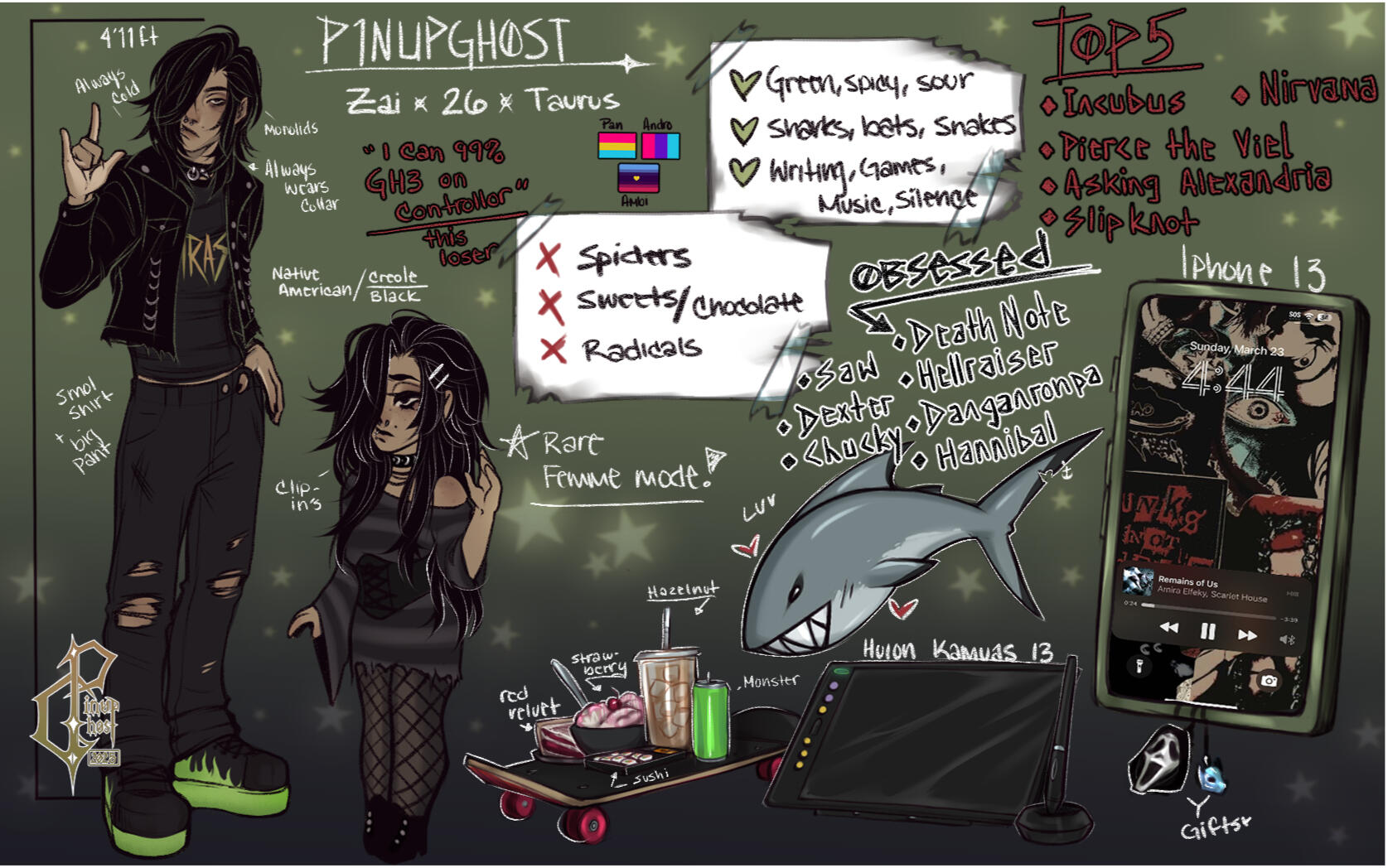 I'm a self-taught digital illustrator, of 10+ years. Primarily I enjoy drawing pinups and slasher content. The characters featured in my artworks also vary! Ranging from Humans, Humanoid, Furrys, to Cryptids. Themes usually remain dark in these parts, but I promise there's some brighter aspects if you take a look.Discord: p1nupgh0st